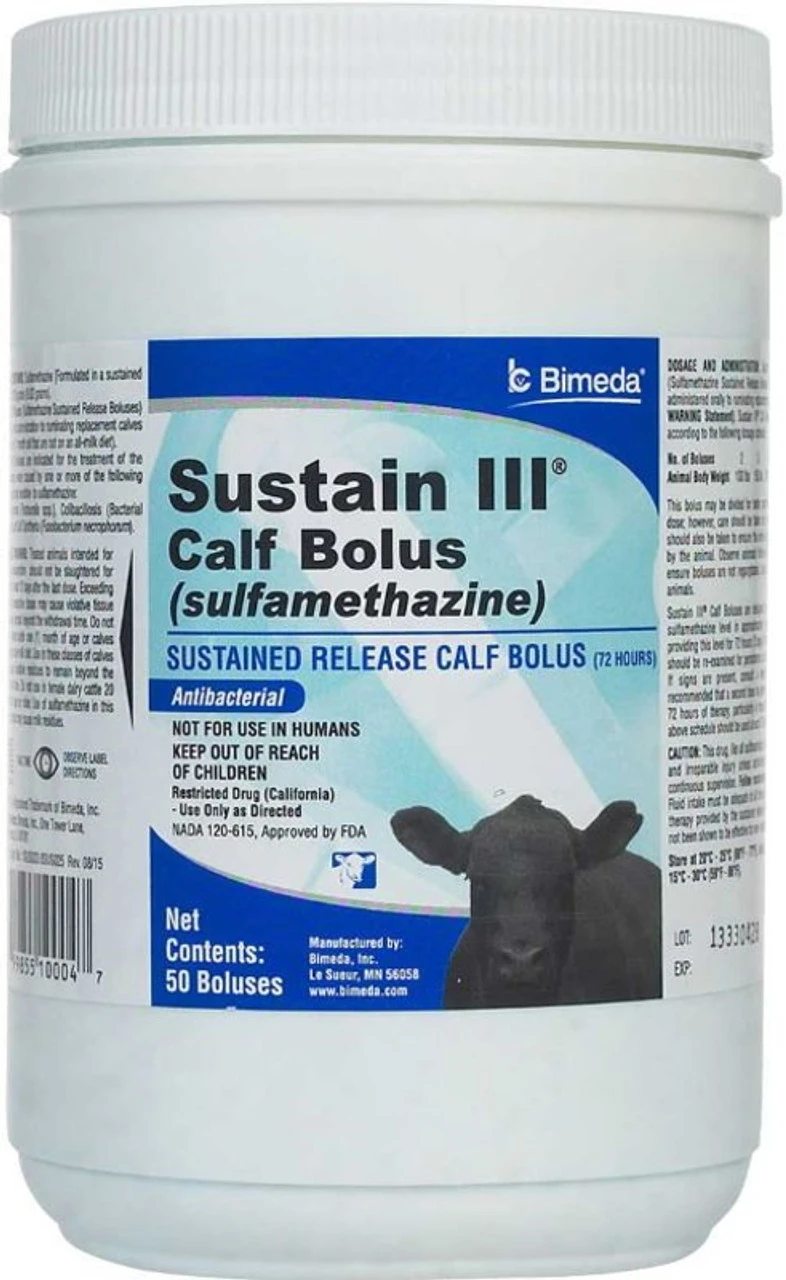 Sustain III Calf Boluses (sulfamethazine) are intended for oral administration to ruminating replacement calves older than 1 month that are not on an all-milk diet. Indicated for the treatment of the following diseases when caused by one or more of the following pathogenic organisms sensitive to sulfamethazine: