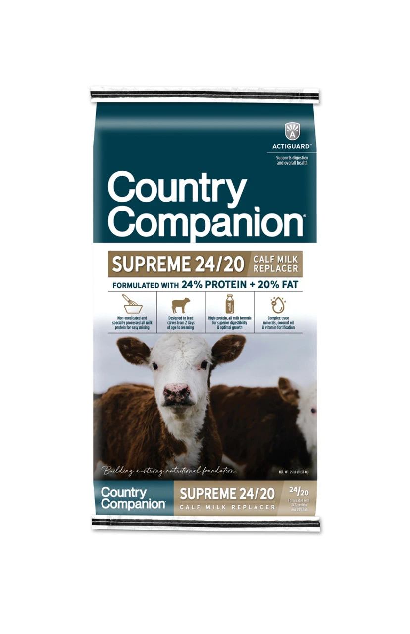 COUNTRY COMPANION SUPREME 24/20 CALF MILK REPLACER also contains ACTIGUARDâ¢, a unique blend of yeast, prebiotics, probiotics, and essential oils that promote a healthy gut and can only be found in Country Companion Milk Replacers!