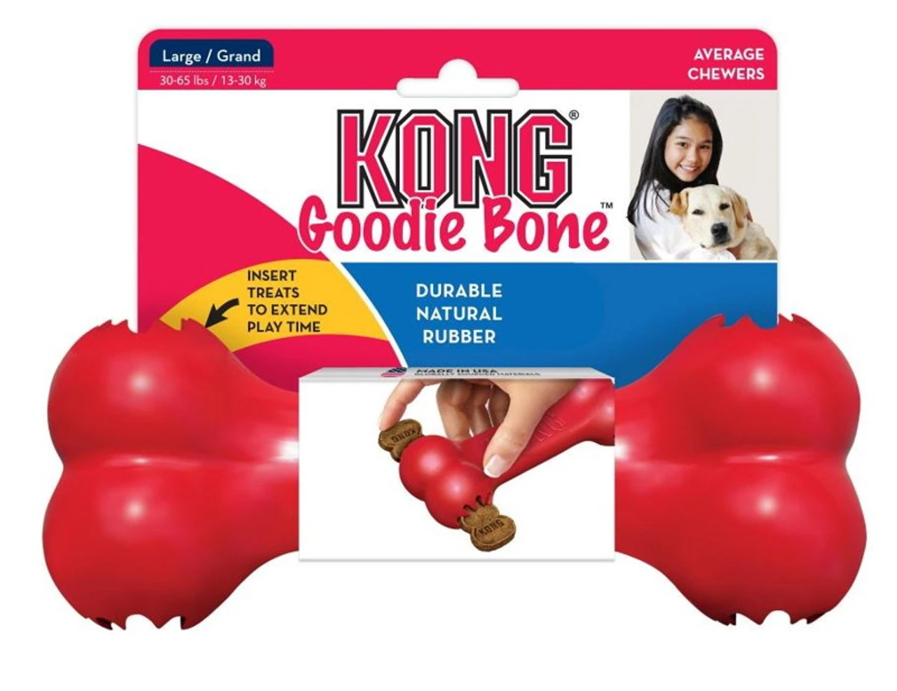 The KONG Goodie Bone™ toy engages dogs that delight in chew sessions. Made from the KONG Classic unique natural red rubber formula, this bone features the patented Goodie Grippers ™ that turn this entertaining toy into a fun treat dispensing challenge that can be stuffed with your dogâ€s favorite kibble. Want to extend the chew session? Stuff with KONG Snacks™ and entice with a bit of KONG Easy Treat™.
