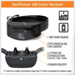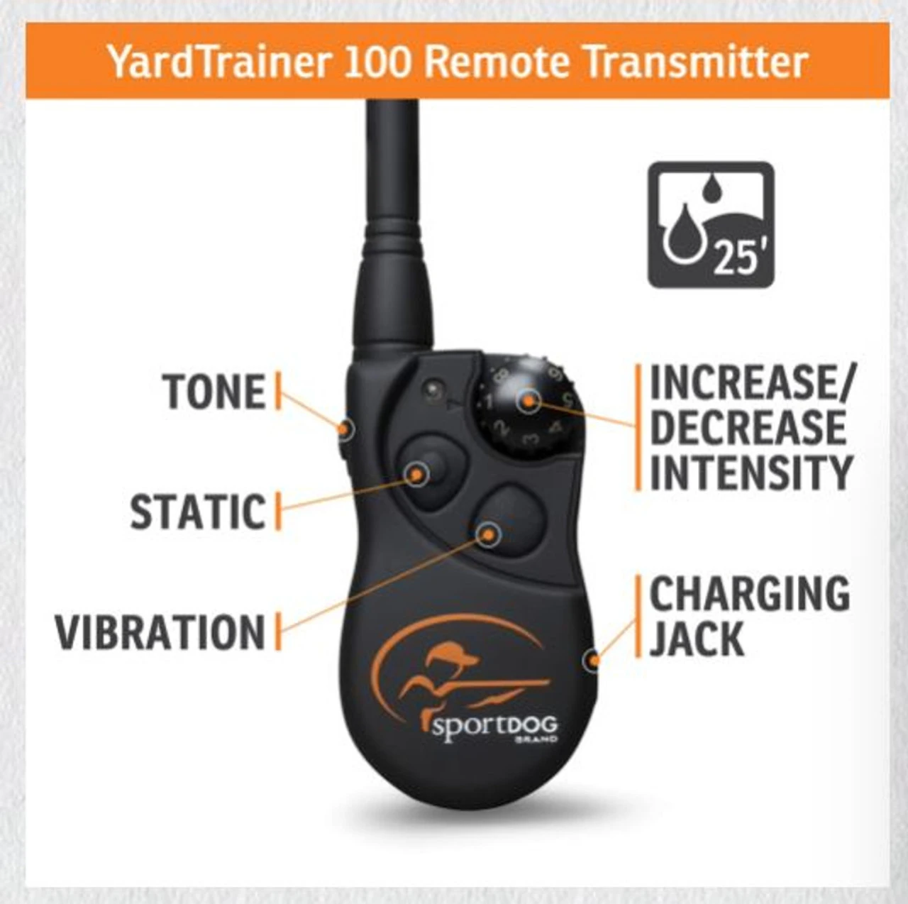 The SportDOG® Brand YardTrainer 100 is designed for basic obedience training around the house, yard, or park – any situation where your dog is within 100 yards of you. It’s a compact and discrete system packed with premium features at a value price. Built with DryTek® technology, the YT-100 is waterproof and submersible to 25 feet. It’s rechargeable and offers three stimulation types: tone, vibration, and eight levels of static stimulation. Each stimulation type has a dedicated button, allowing you to easily deliver the stimulation that best fits the situation and your dog’s temperament. This intuitive design makes operating the remote a breeze, so you can focus on what’s important: your dog.