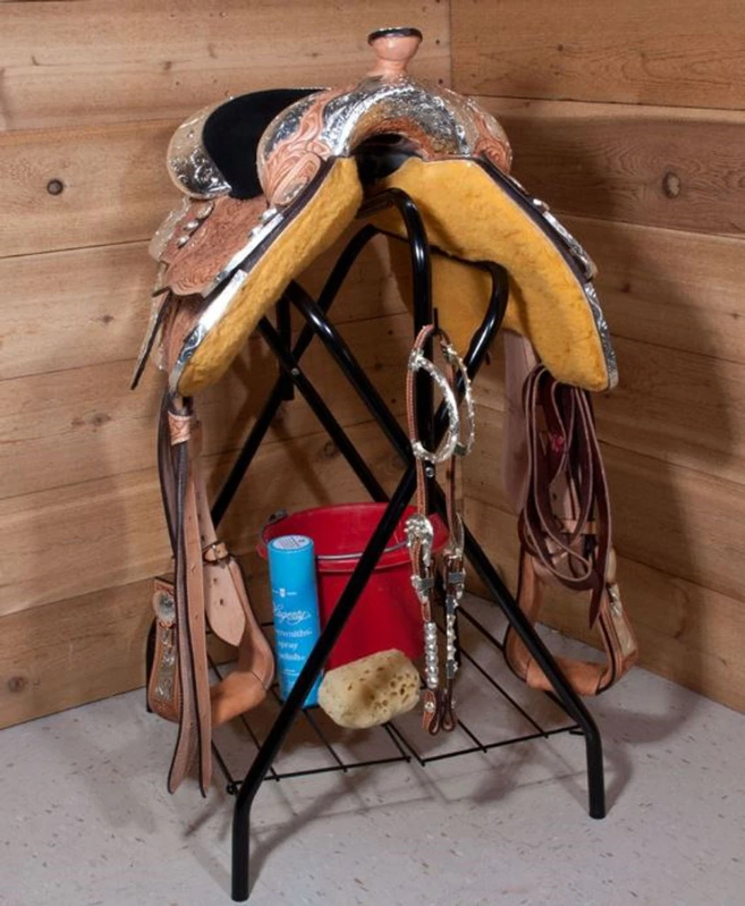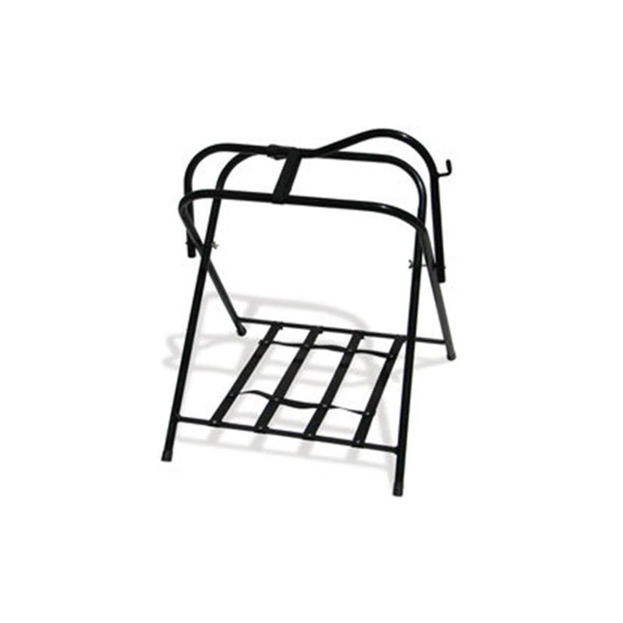 - The Folding Saddle Stand is made of black metal tubing which has a bridle hook on the front and locking grid for extra storage.