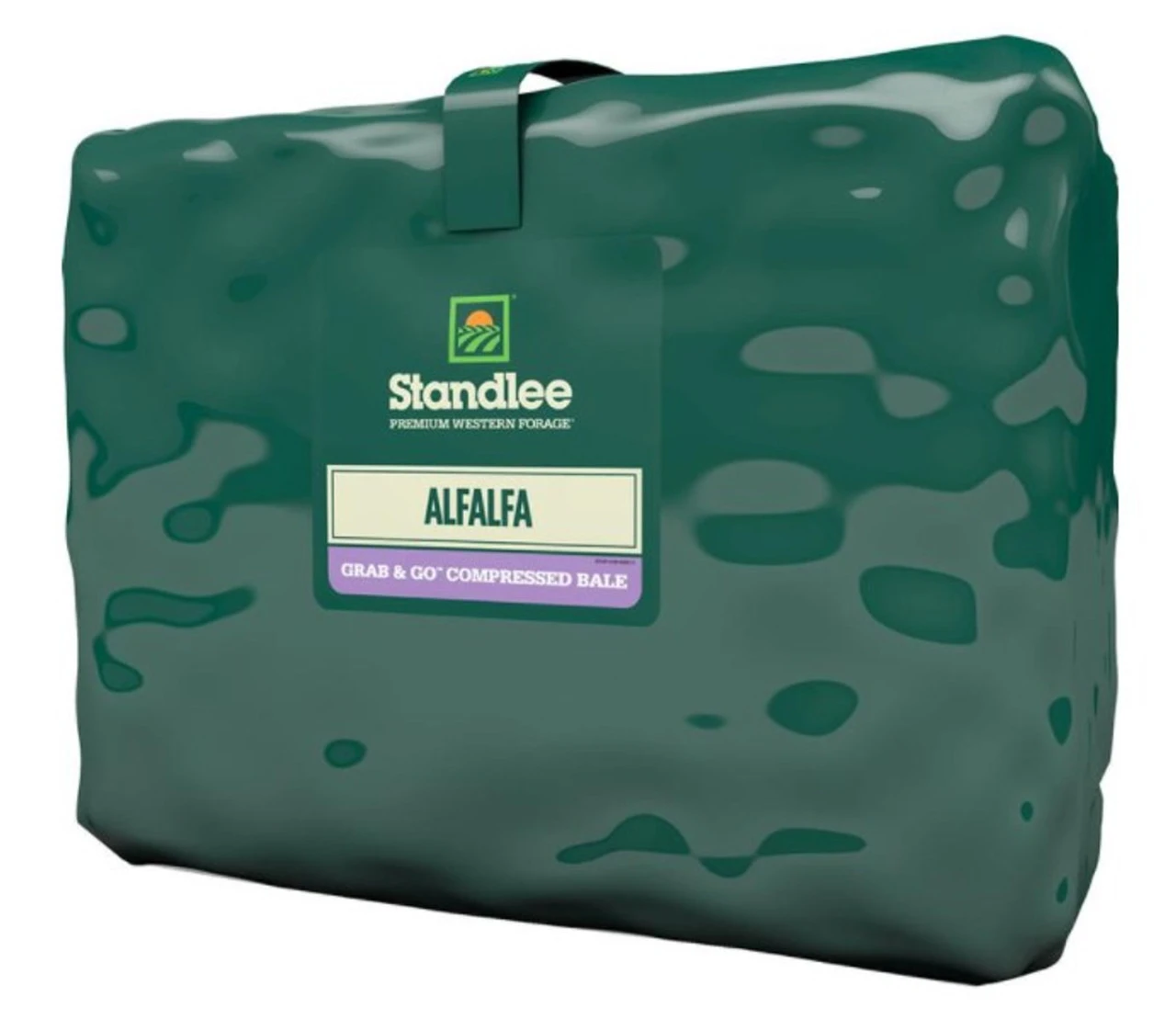 Premium Organic Alfalfa Grab & Go Compressed Bales are formed by allowing Standlee Premium Western Forage to grow to the proper stage of maturity, cutting the plants, allowing them to sun-cure (dry) to an acceptable moisture level and baling the forage at the optimal time. Standlee Premium Western Forage creates Grab & Go compressed bales of forage from a large 4â€x4â€x8†bale that is put through a press, sliced horizontally, pushed onto a scale, weighed, compressed, banded and then shrink-wrapped. 50lbs