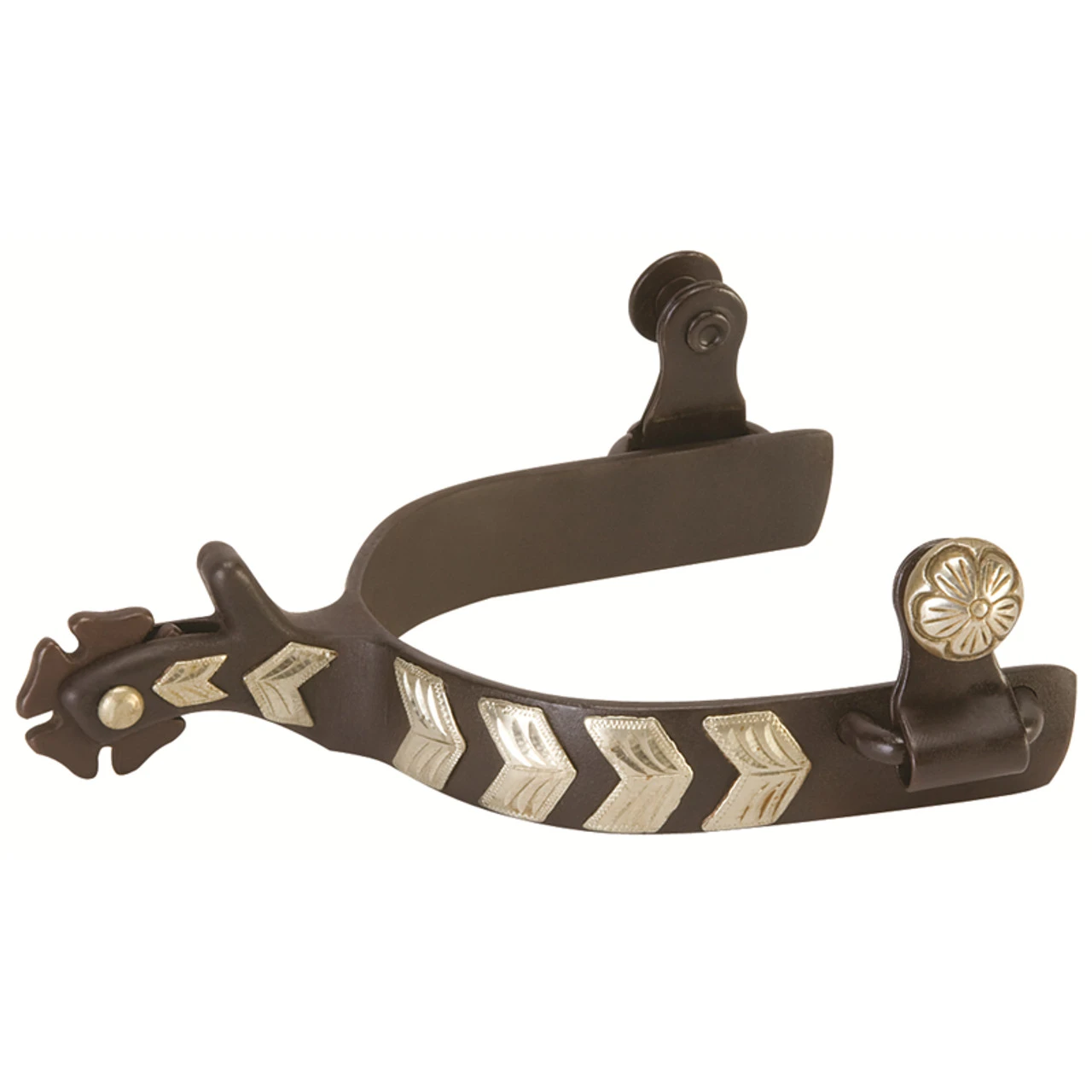 These antiqued spurs have a 1-1 4 inch shank, a 3 4 inch band and a 6 point rowel. German silver chevron trim adds extra style and flair. Men’s size.
